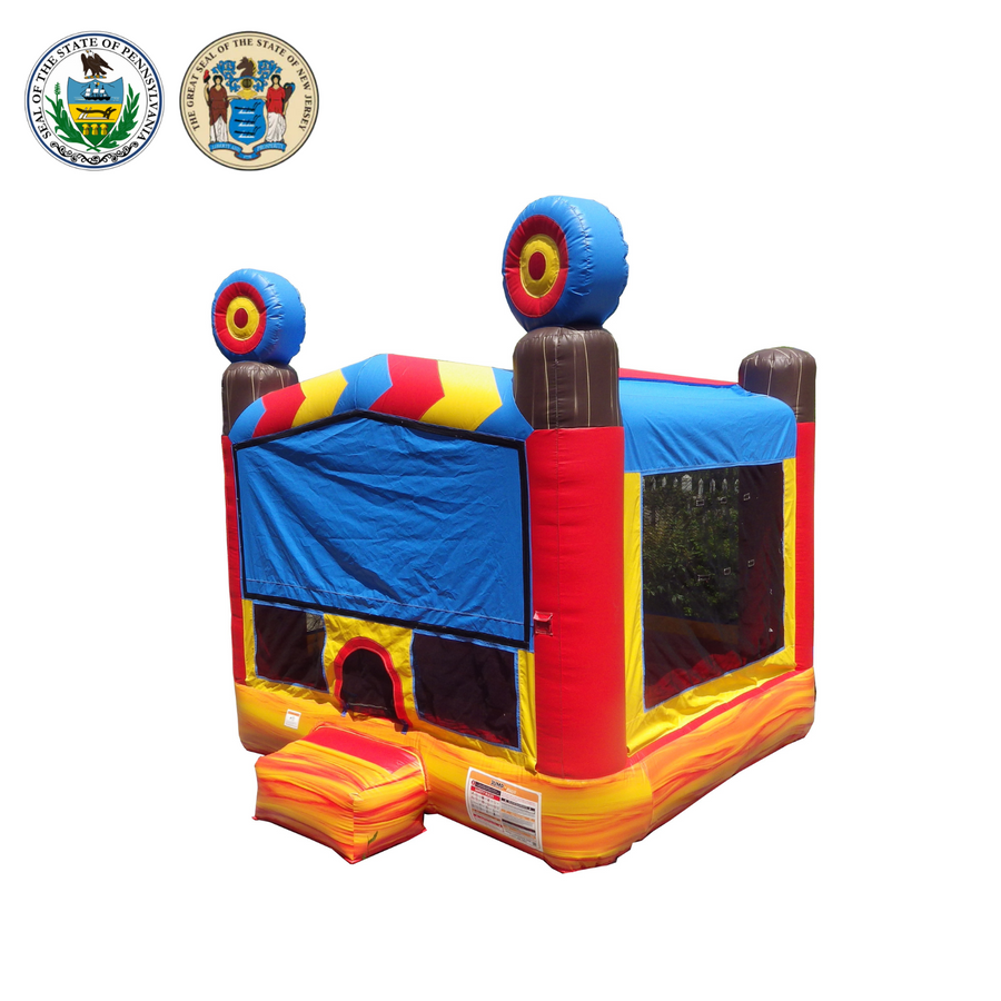 The Target 13' X 13' Bounce House is always on the mark! Its bright design includes archery targets at its corners. A basketball hoop is also inside to complement the ample bouncing space. Made with lead-free 15 oz. PVC vinyl, this unit is a reliable inflatable for parties and events!