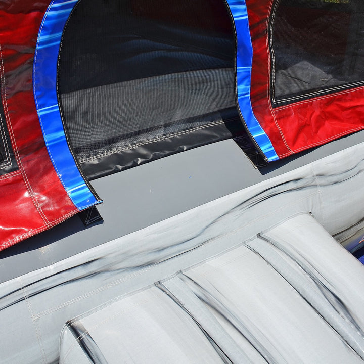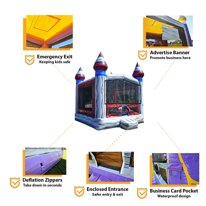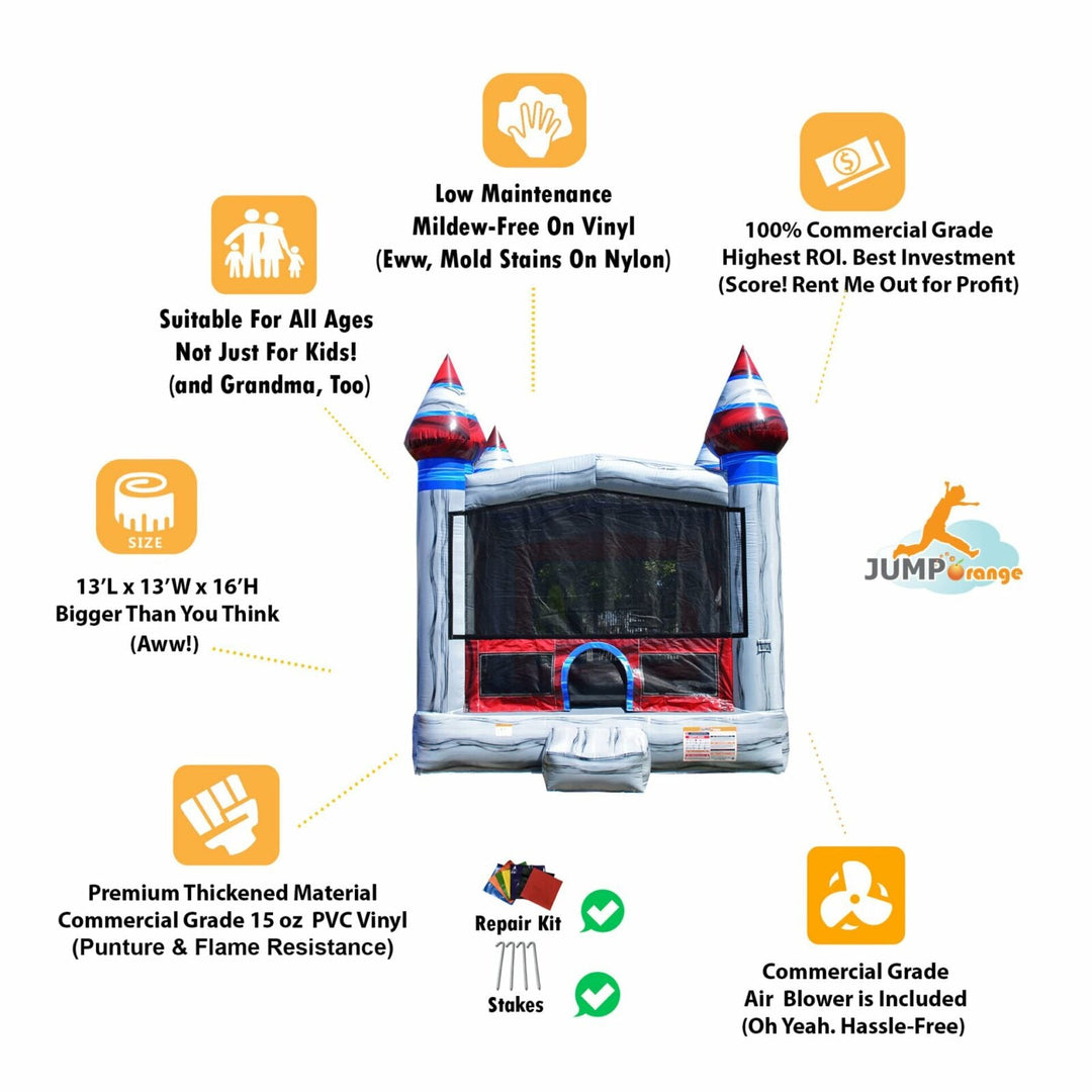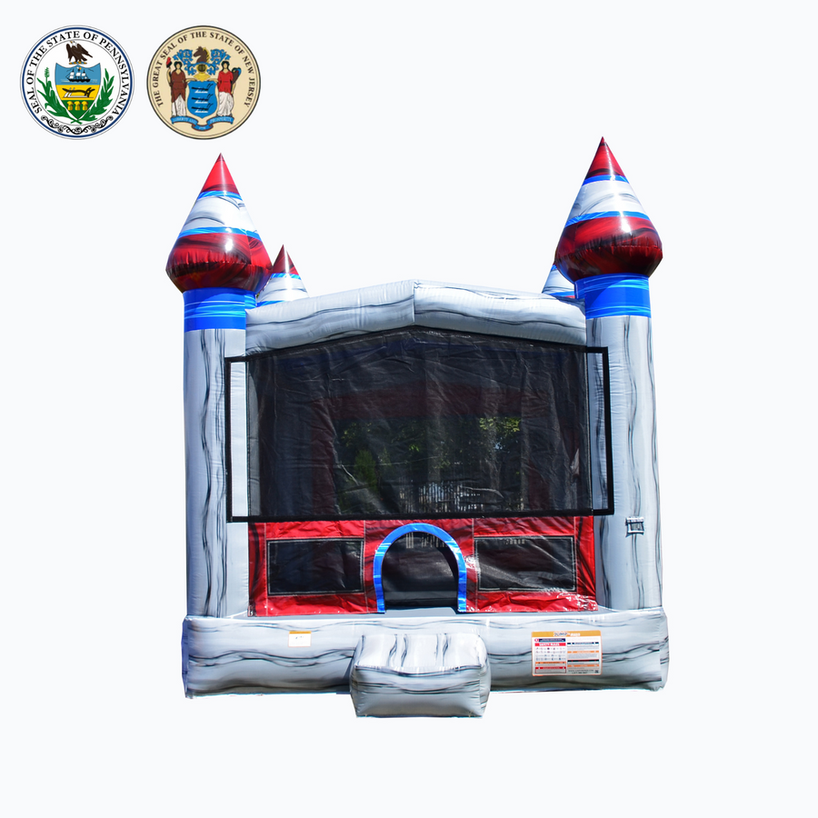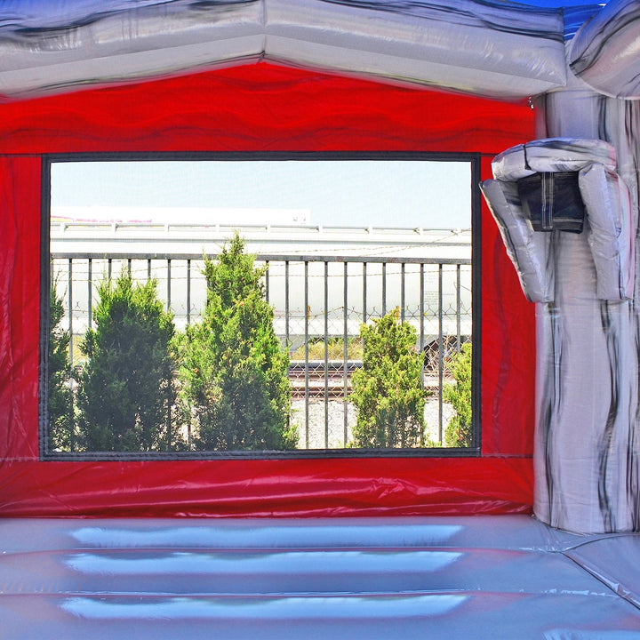 The Titanium 13' X 13' Bounce House is a top-tier bounce house! Its silver and red color scheme shine like steel. A basketball hoop is also inside to complement the ample bouncing space. Made with lead-free 15 oz. PVC vinyl, this unit is a reliable inflatable for parties and events!