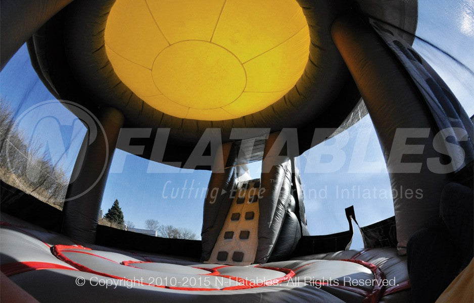 We've taken our UFO Combo and made it even better. This combo now features a slide that can be used with or without water! In addition, it features a large bouncing area, high visibility FingerSafe™ mesh netting, a climbing wall and a tall slide. There are also loops around the outside perimiter of the saucer that allow for sliding in optional LED rope lighting (not included).