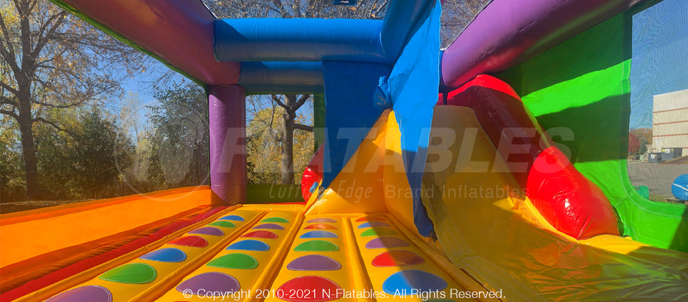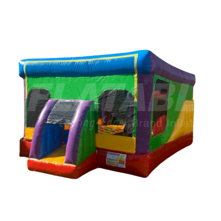 At only 8' tall, this completely enclosed wacky-colored unit has a bouncing surface, climb & slide, and an Entanglement™ game mat sewn onto the bouncer surface. There is also room for a removable art panelWide mesh windows also let parents and operators keep an eye on the kids inside. This unit is perfect for a backyard event or indoor play center.